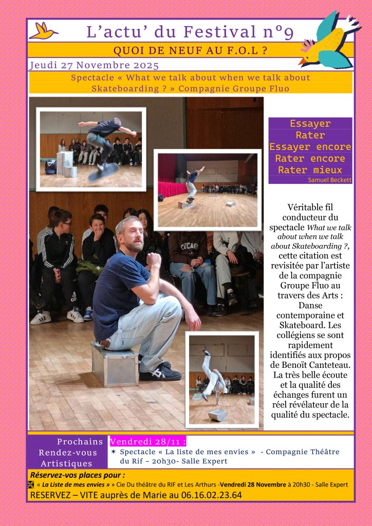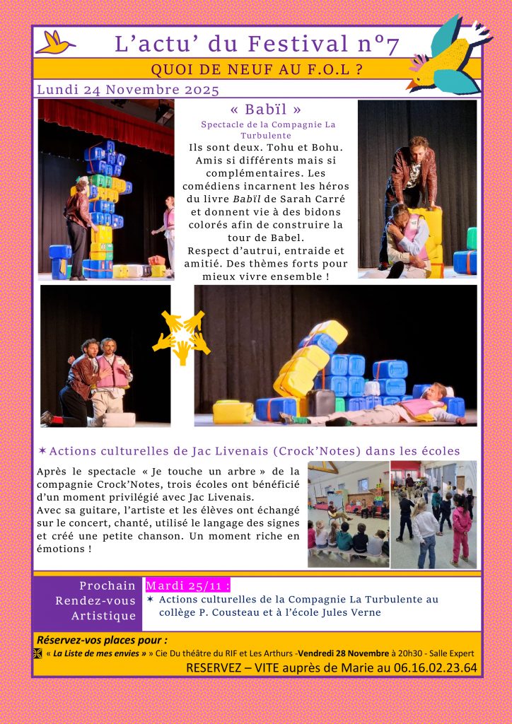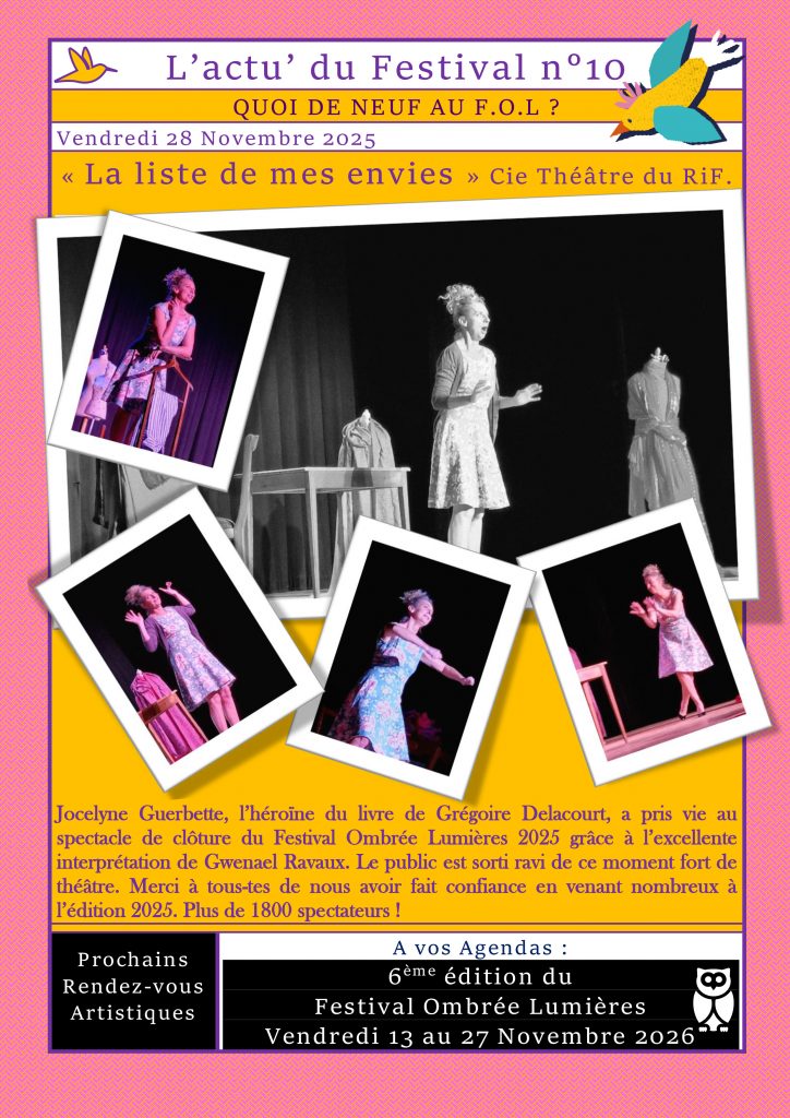 - Spectacle « La liste de mes envies » (clôture) : 15 € plein tarif/ 13 € tarif réduit/ 7 € enfants – 12 ans